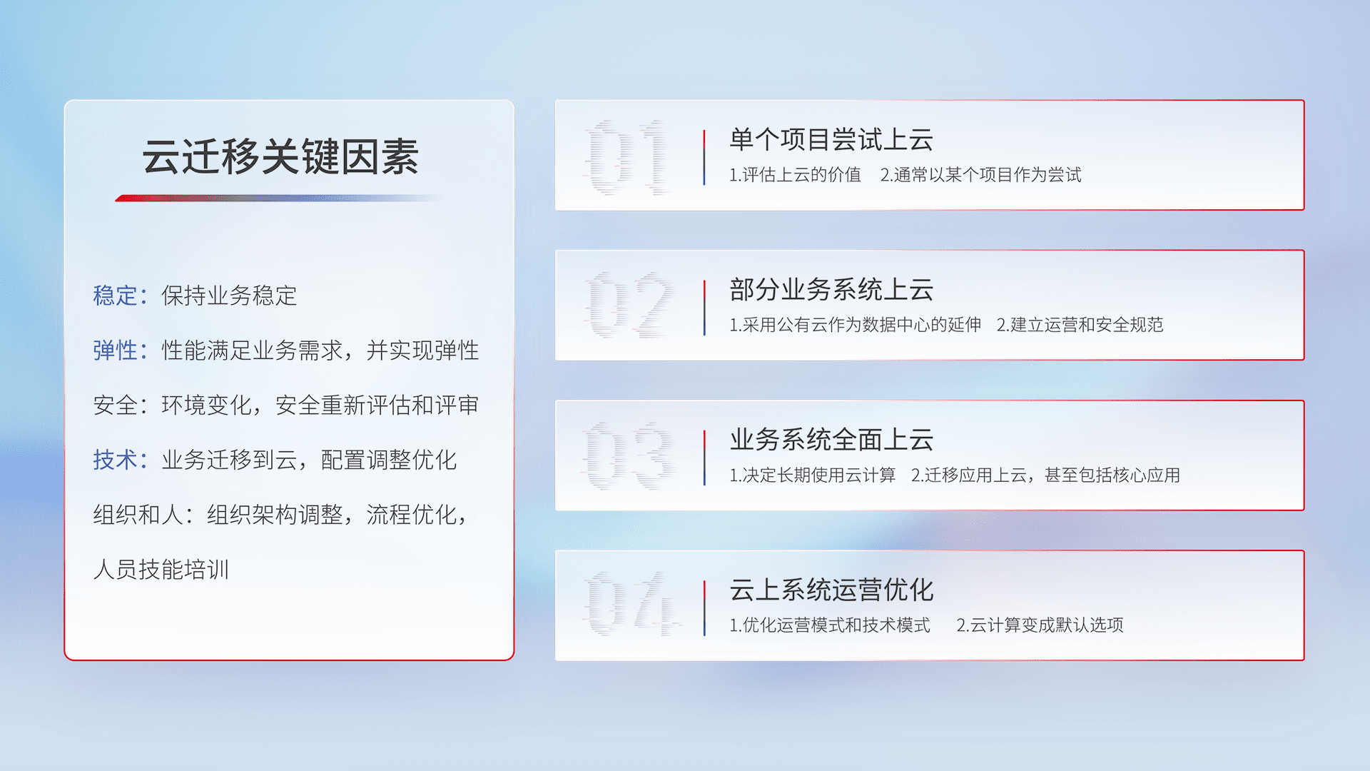 结合实际业务,,,从规划设计、、、、云平台选型、、云原生改造、、、、数据迁移、、、集成交付,,,,迁移全过程为客户识别最佳上云路径,,,,做好风险识别管理,,,设计网络架构、、、身份权限、、、、安全审计合规、、、、操作审计、、日志审计、、监控告警策略、、多站点容灾设计等,,,,对云上基础设施进行整体规划,,,提升IT治理水平,,,,以满足弹性、、、、高可用、、、、高性能的需求。。。